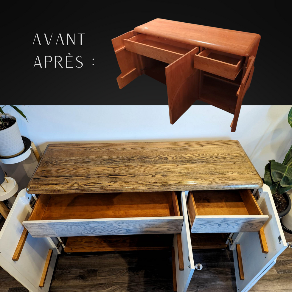 Au départ, ce meuble ne m'inspirait rien de très clair. C'est pourquoi j'ai décidé de m'attarder un peu plus à son aspect arrondi, et même à son relief en devanture, me rappelant les formes d'un nuage. J'ai trouvé que ce meuble était donc parfait pour une chambre d'enfant. Offrant beaucoup de rangement, étant solide et sécuritaire. J'ai tout de suite compris que ce meuble deviendrais la table à langer de mes propres futurs enfants. Il ne restait qu'à lui redonner un look magnifique tout en incluant une thématique du ciel (Soleil/Nuage/etc).